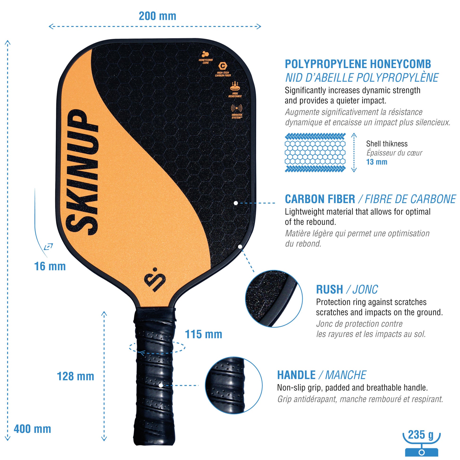 The rackets feature an ergonomic grip with a perforated and padded handle, ensuring optimal comfort and a non-slip grip for perfect ball control. The carbon fiber protective ring protects the racket from impacts and scratches.